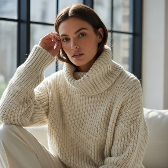 • Tasarım Detayları: Yüzü boğmayan, dökümlü ve geniş balıkçı yaka (turtle neck) tasarımı mevcuttur. Düşük omuz (drop shoulder) kesimi, kazağa modern ve salaş bir hava katar. Kol ağızlarında ve etek ucunda bulunan geniş ribana detayları, formun bozulmasını engeller. Yanlarda bulunan mini yırtmaçlar, pantolon veya eteklerin içine ön kısmını kıvırarak kullanma (french tuck) imkanı tanır.